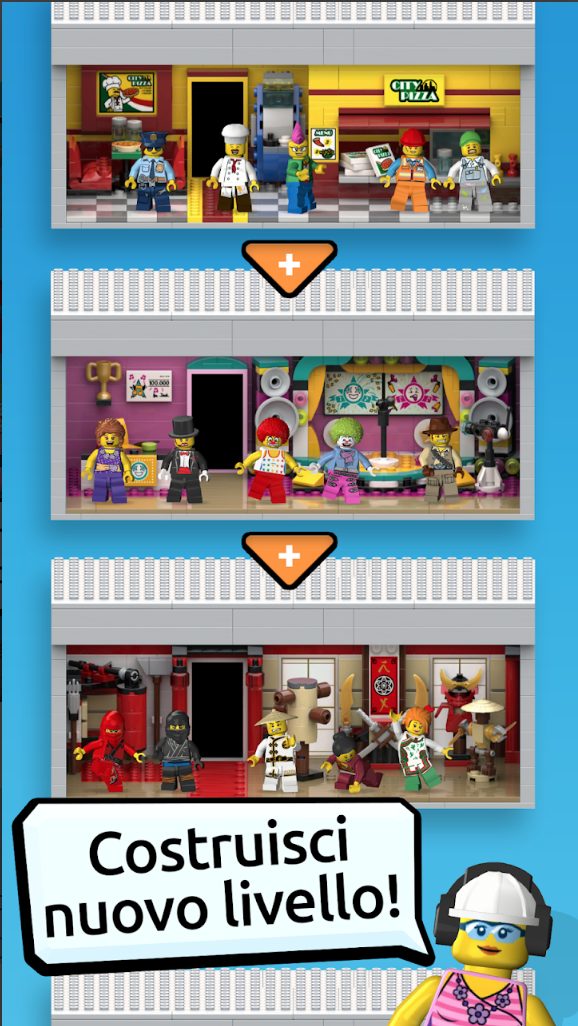 Costruisci e gestisci la tua LEGOⓇ Tower! Costruisci una vasta gamma di appartamenti e di aree commerciali dove far vivere, lavorare e giocare le Minifigure qui residenti. Visita le torri degli amici e scambia oggetti per aiutarli a costruire. Colleziona centinaia di pezzi unici per le Minifigure e scopri i personaggi nascosti. Costruisci la LEGOⓇ Tower dei tuoi sogni, sempre più alta. L’unico limite è il cielo!