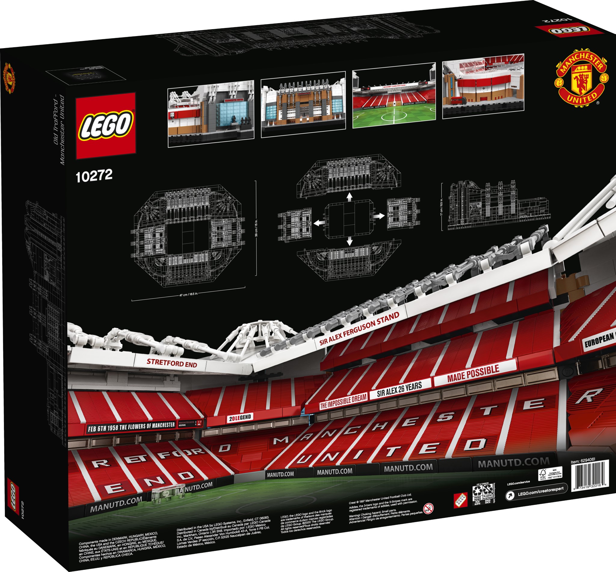 - Lo stadio di calcio LEGO Old Trafford-Manchester United misura 6,5 ”(18,5 cm) di altezza, 18″ (47 cm) di lunghezza e 15 “(39 cm) di larghezza. La dimensione perfetta per presentare dettagli autentici tra cui il tunnel dei giocatori e una statua di Sir Alex Ferguson.