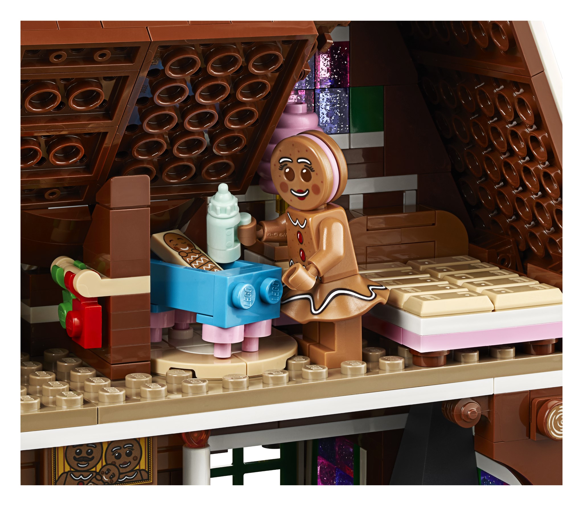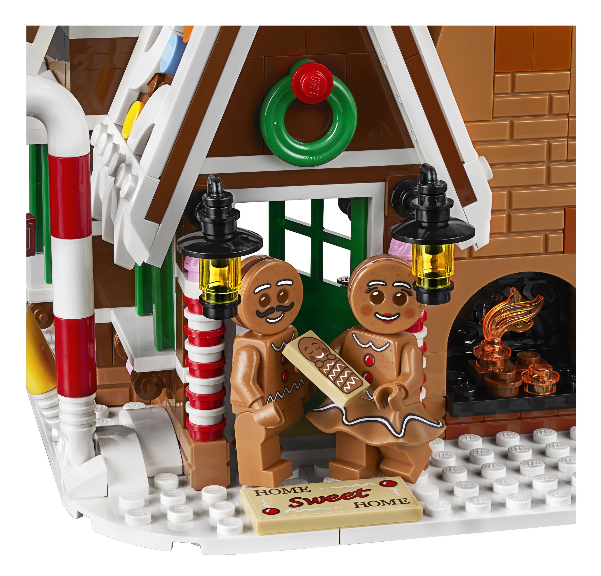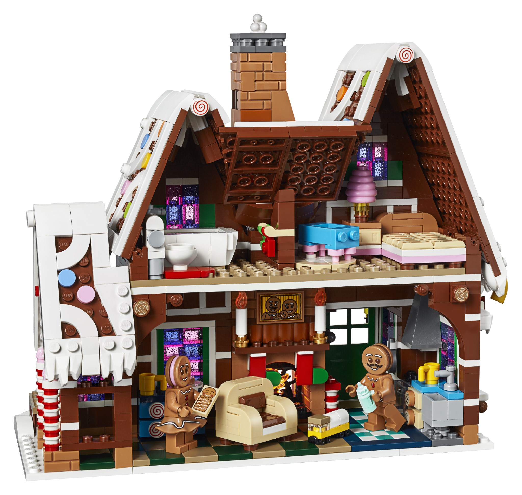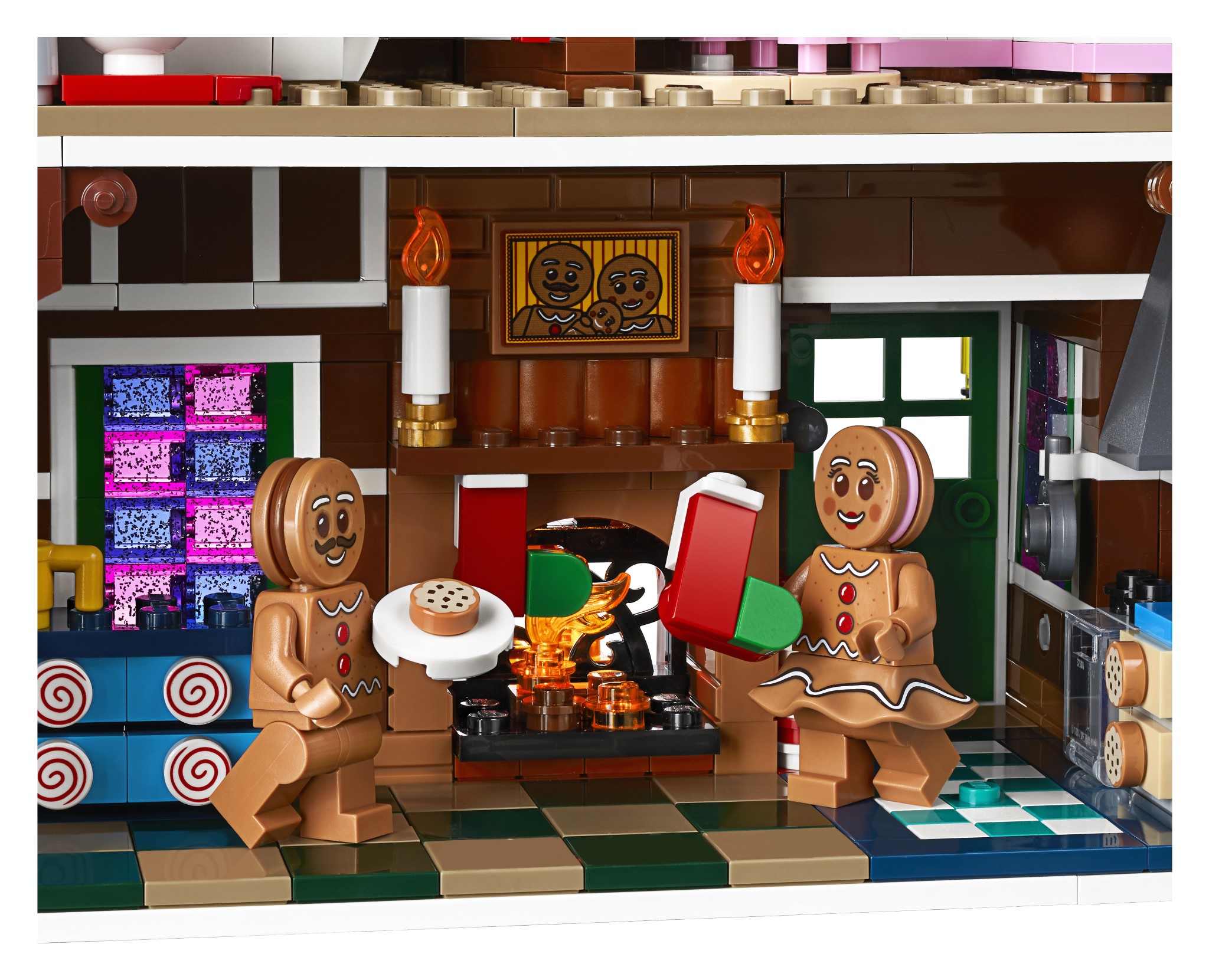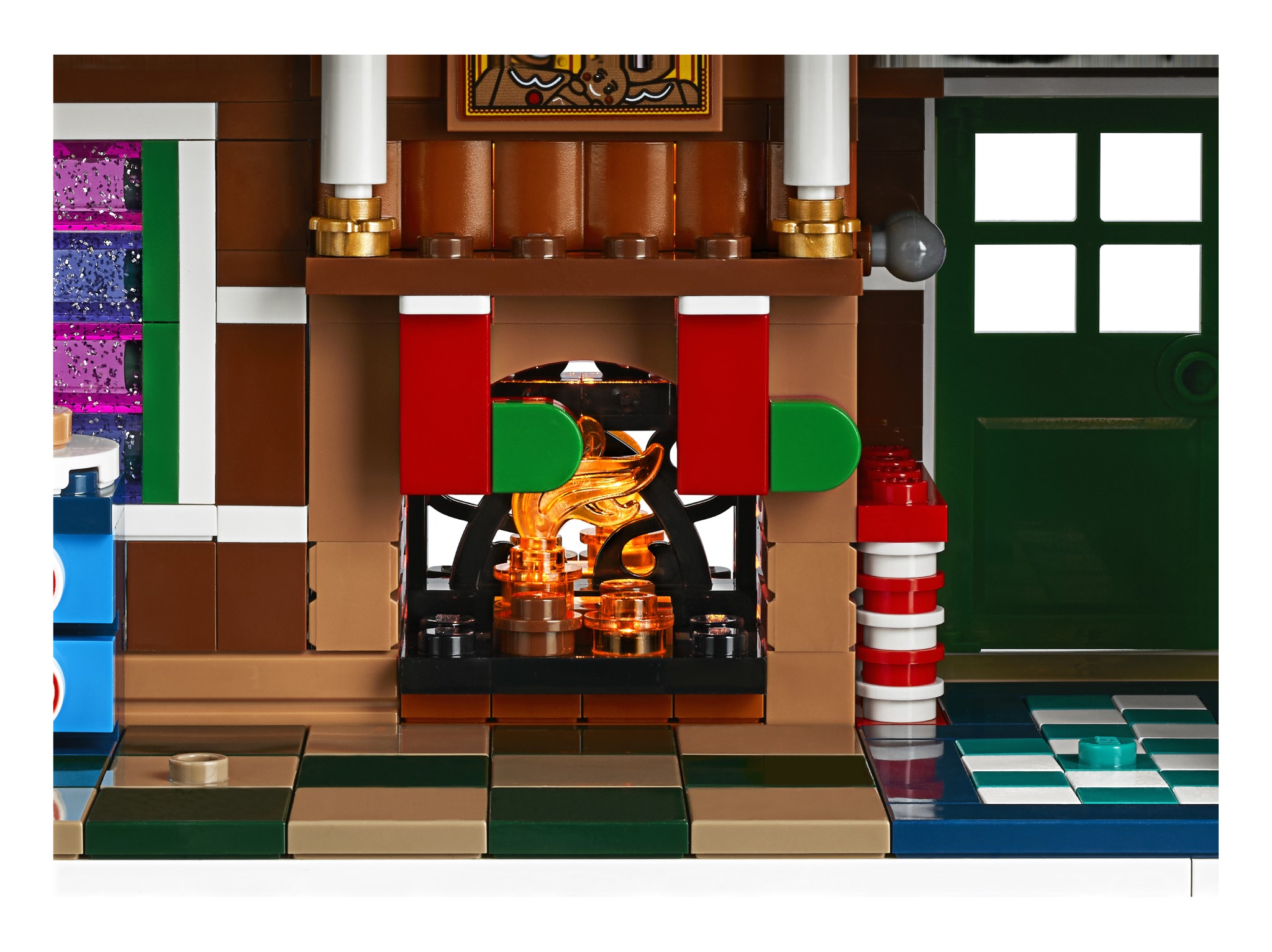 Premendo il pulsante a forma di fumo sul camino si accende il mattoncino luminoso per far brillare il camino. All’interno della casa ci sono una serie di dettagli e arredi, tra cui una camera da letto con un letto di cioccolato e una lampada per zucchero filato e altri decori festivi.