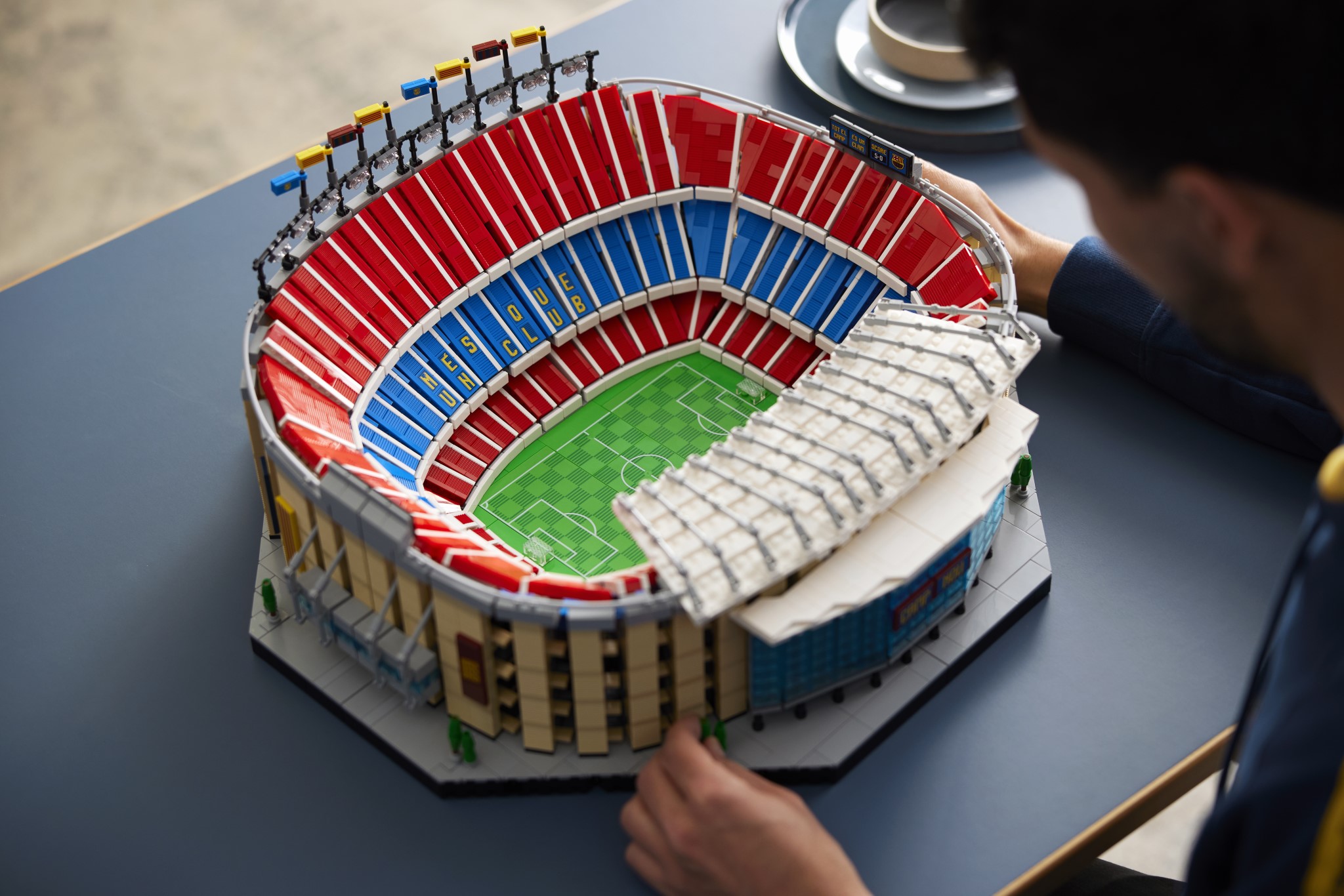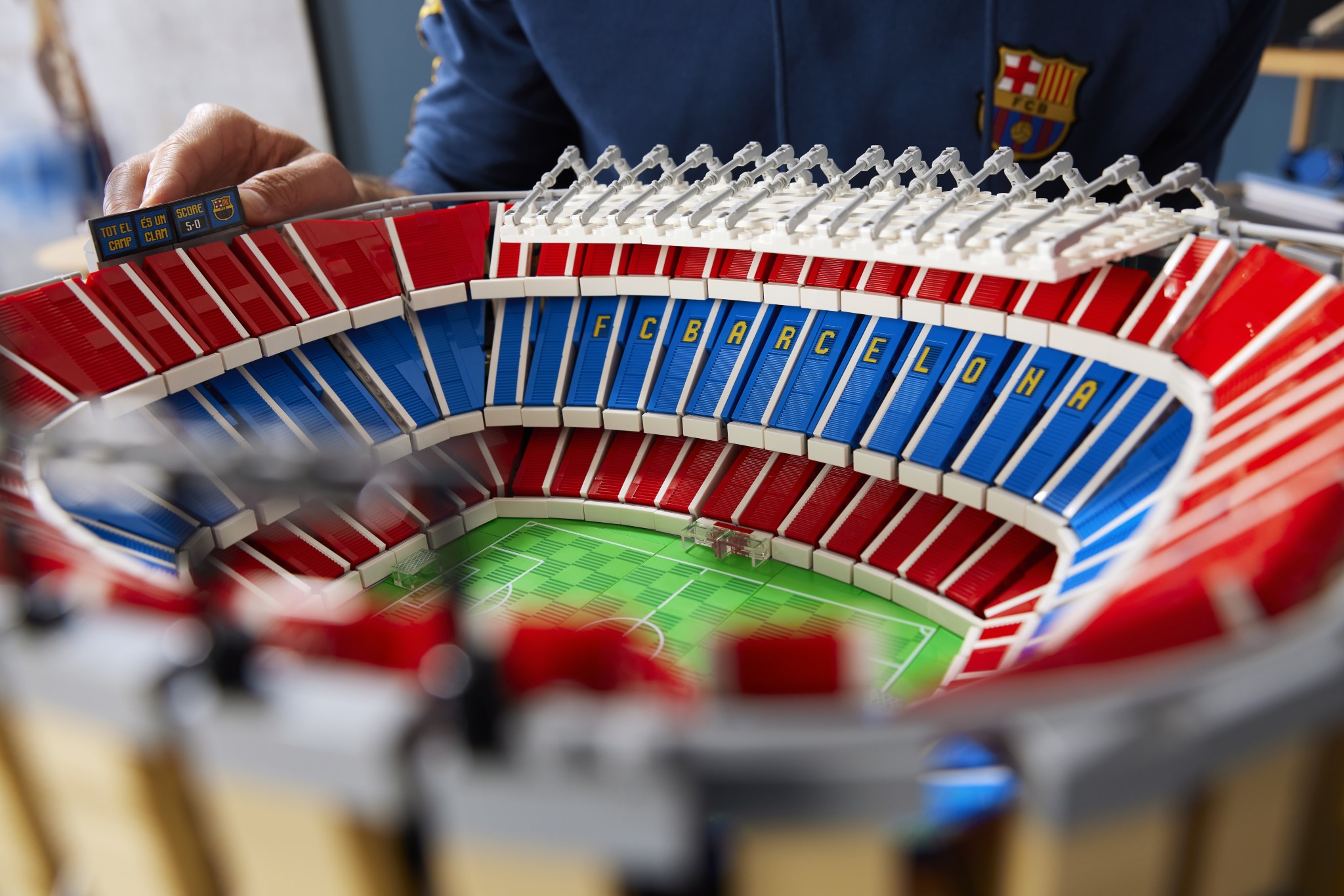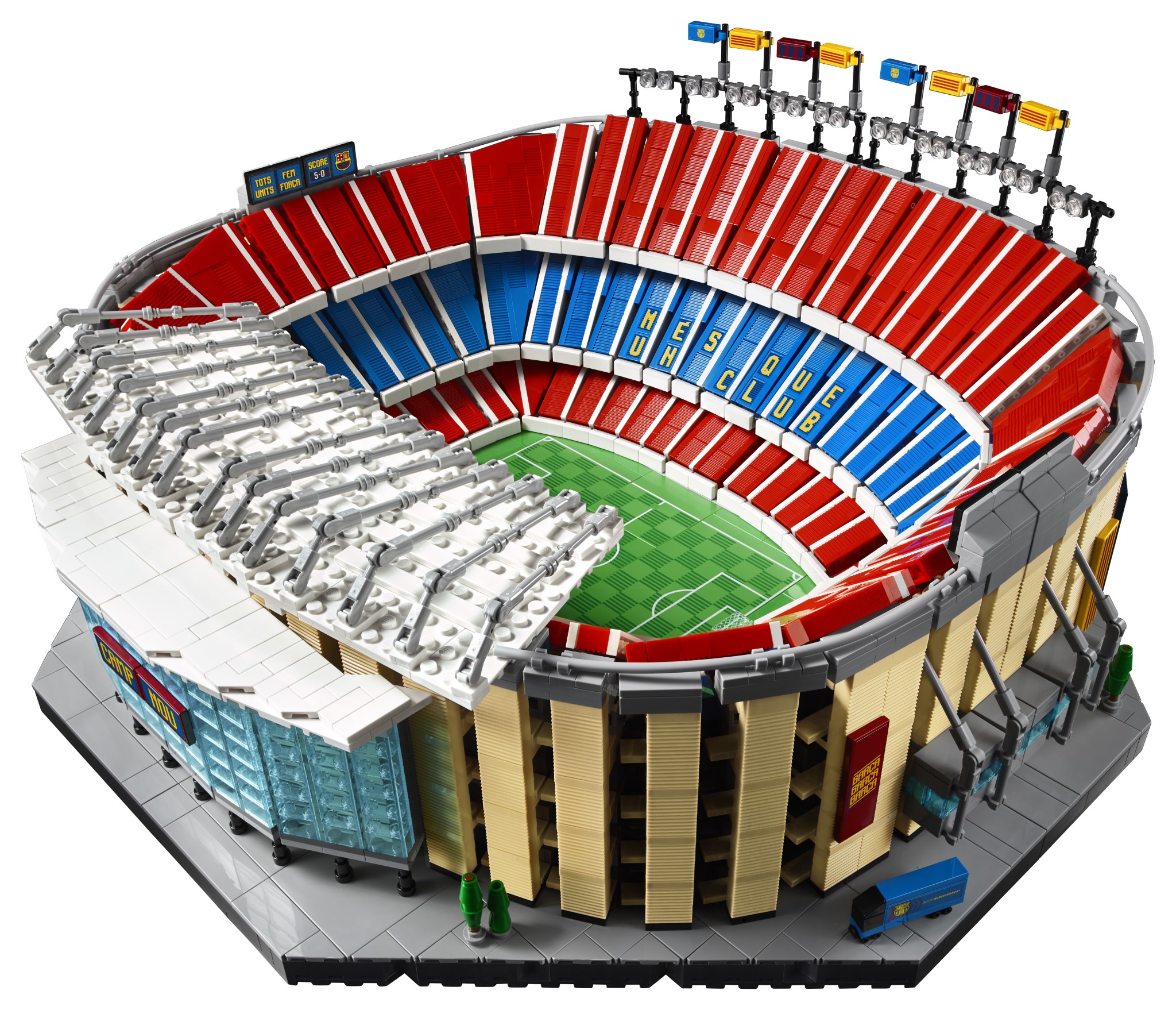 Il set riproduce nel dettaglio l’intero campo da gioco, le tribune, il tunnel dei giocatori e persino l’allenatore della squadra. Presenti anche il tabellone, che fa riferimento alla storica vittoria del Club per 5-0 contro il Real Madrid, e il motto dell’FC Barcelona “Més que un Club”, orgogliosamente esposto sugli spalti.