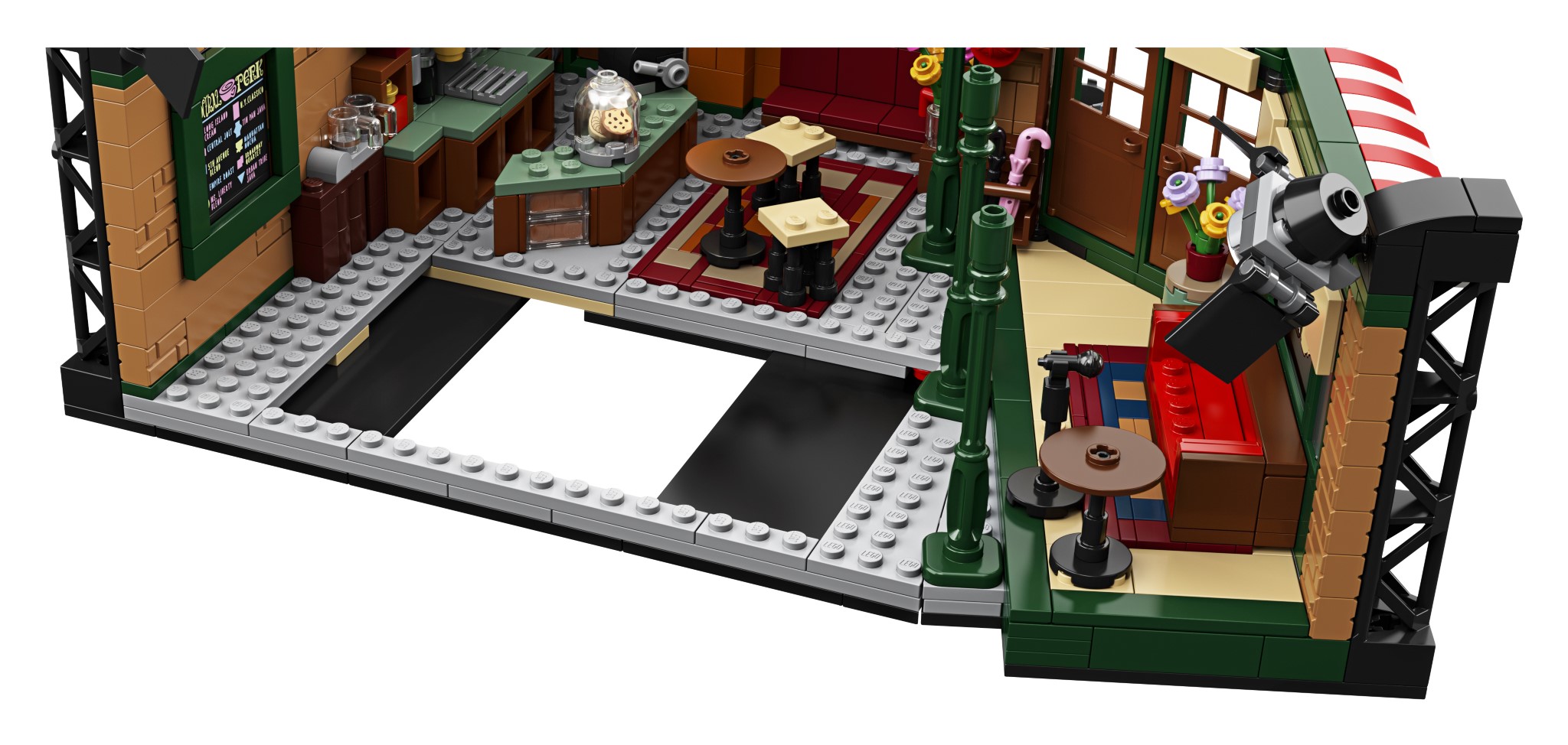 I costruttori possono anche ricreare il palcoscenico in cui Phoebe Buffay ha eseguito le sue canzoni con la chitarra (e una volta Ross Geller ha suonato la sua tastiera), oltre a includere una macchina da caffè in mattoni, un barattolo di biscotti con due biscotti, un menu e altri oggetti realistici.