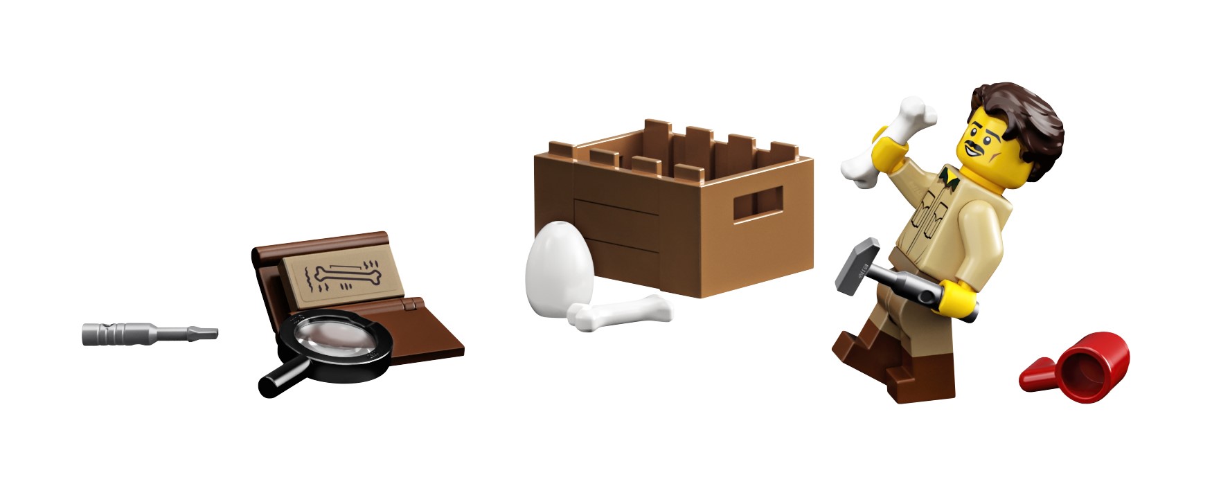 - Include anche un personaggio dello scheletro di uomo sapiens con espositore e la minifigure di una paleontologa con una cassa costruibile, più uova di dinosauro, un osso, un cappello e un libro per tanto gioco creativo.