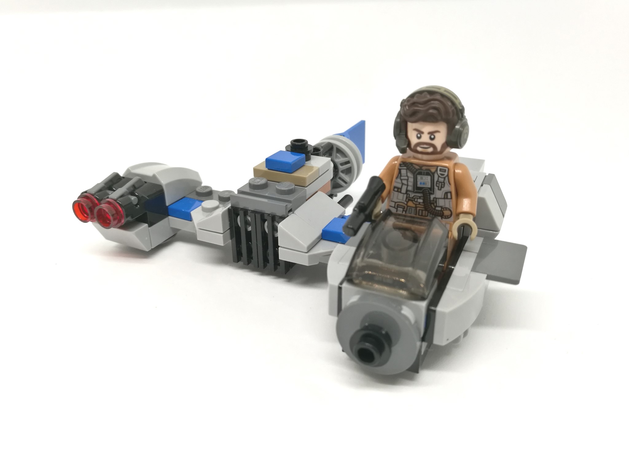 La minifigura inclusa è il pilota dello Speeder della Resistenza, dotato di una particolare capigliatura che comprende, in un unico pezzo, anche le cuffie con microfono.