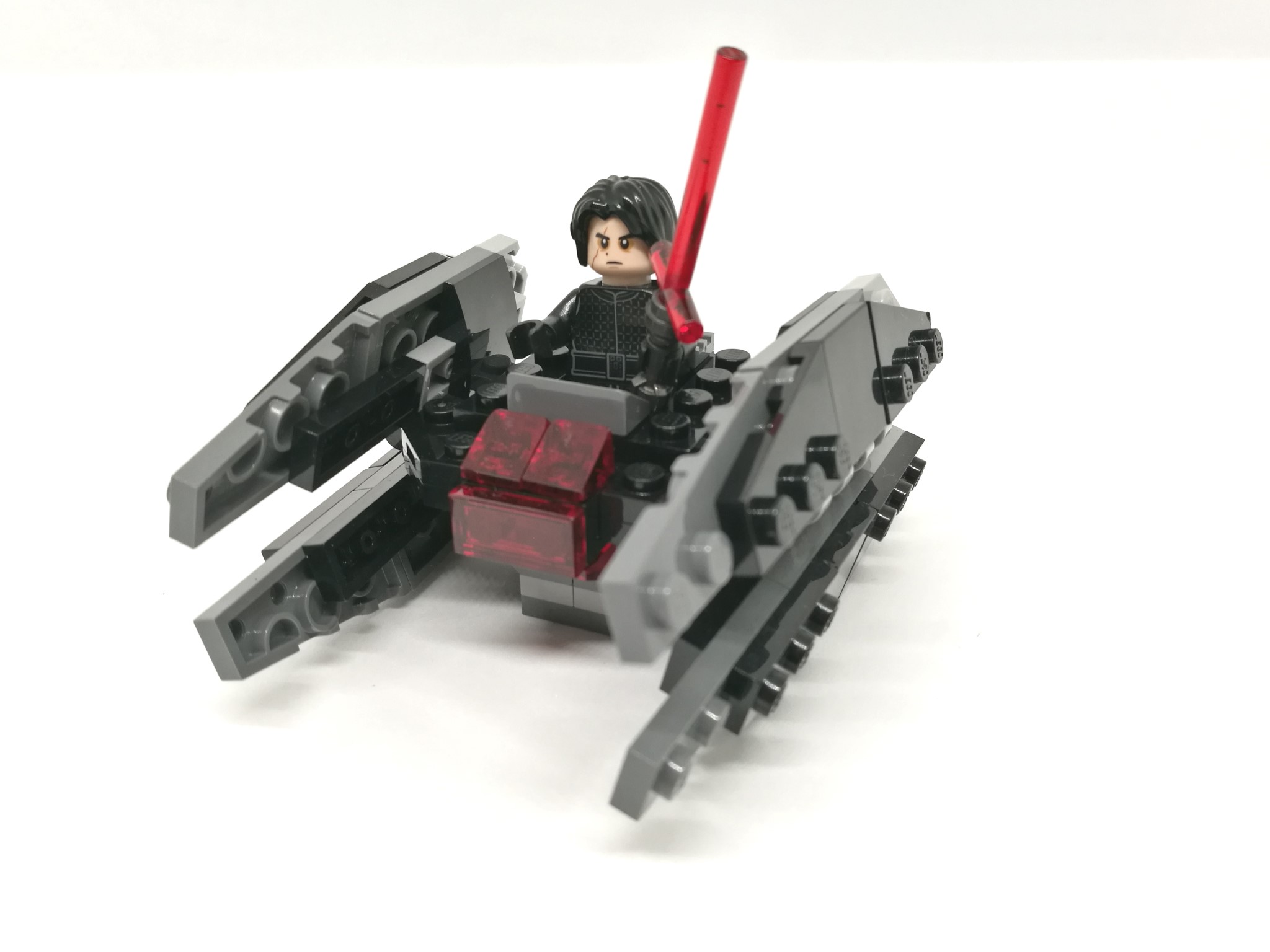 La minifigura di Kylo Ren inclusa è nella versione senza casco, con il volto sfregiato: è dotato inoltre della caratteristica spada laser rossa.
